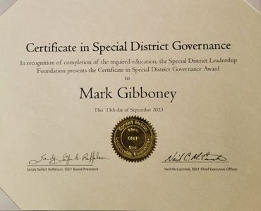 Special Districts Leadership Foundation (SDLF), workshops and training sessions which included studying board and staff roles, building a foundation for good governance, what board members need to know about district finances, best practices, and fulfilling the district’s mission. I am proud to have been awarded the SDLF Certificate in Special District Governance. Since then, I have earned CSDA Certificates for advanced classes in community engagement, public agencies legal representation, fiscal accountability, best practices for district investments, and legislative relations.